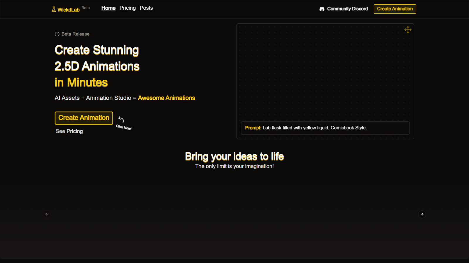 WickdLab — онлайн-студия для быстрой сборки 2.5D-анимаций на базе ИИ. Пользователь загружает свои изображения или берет готовые ассеты из публичной библиотеки, а затем оживляет их в интуитивном 3D-окружении.
