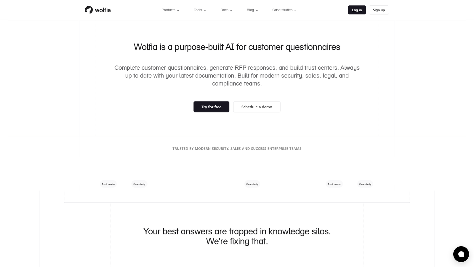 Wolfia — специализированный ИИ-сервис для работы с клиентскими опросниками, RFP и вопросами по безопасности. Платформа помогает быстро и точно заполнять анкеты заказчиков, отвечать на сложные технические запросы и поддерживать актуальный trust center.