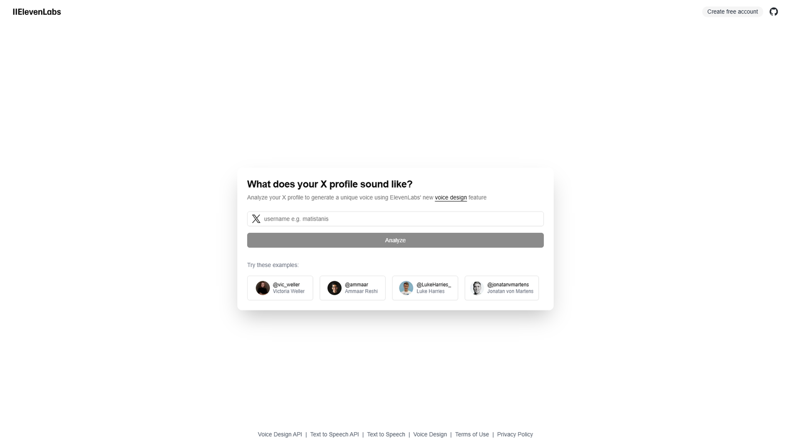 Вы указываете @username в X, после чего система с помощью ИИ анализирует профиль и генерирует кастомный голос. Технология ElevenLabs Voice Design позволяет создавать новые голоса, а не только клонировать существующие, что делает результат по-настоящему уникальным.