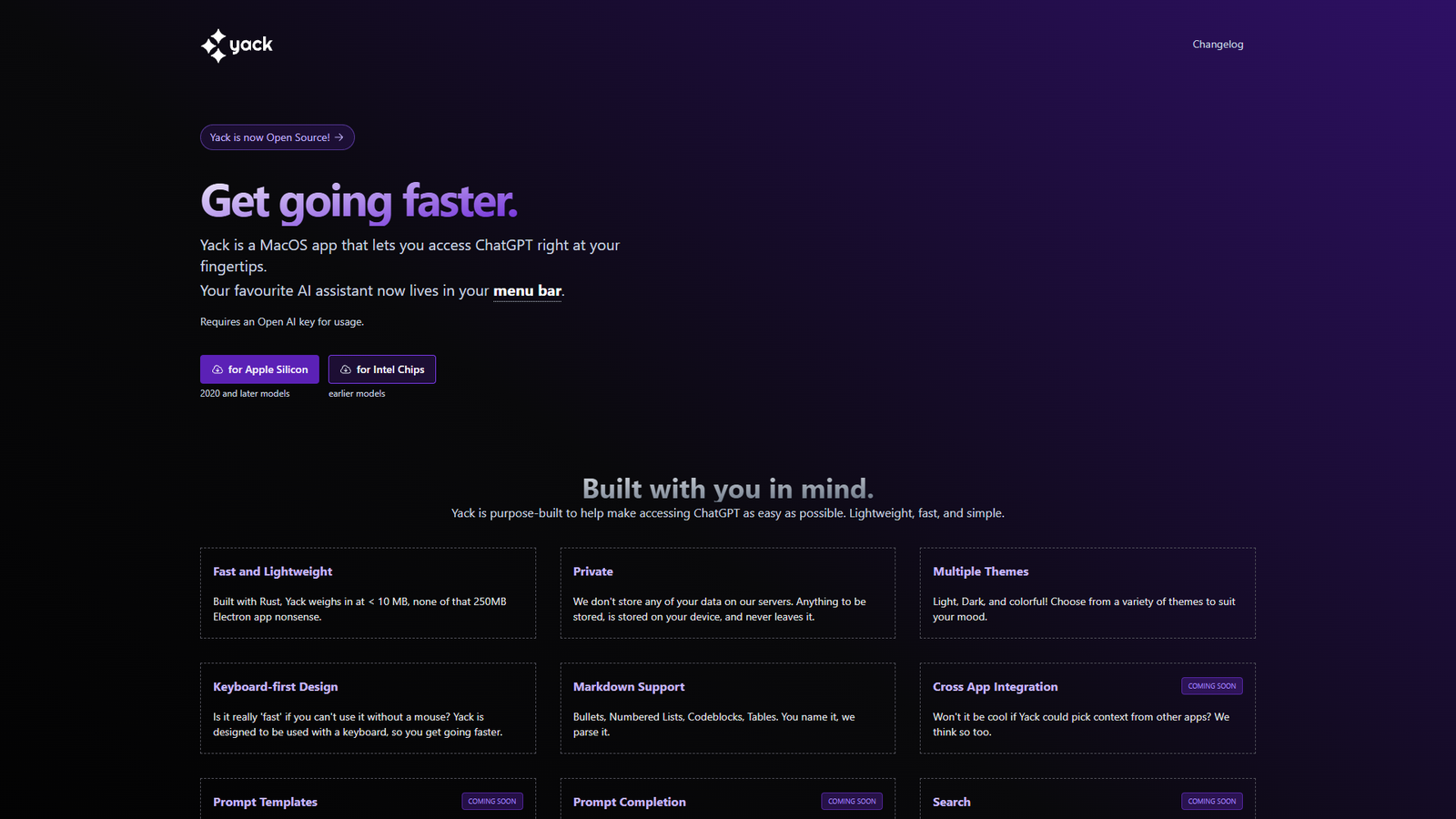 Yack — это лёгкое и быстрое приложение для macOS, которое переносит ChatGPT прямо в строку меню вашего Mac. Теперь ваш любимый ИИ-ассистент всегда под рукой: вызывайте его сочетанием клавиш и общайтесь, не отвлекаясь от текущей работы.