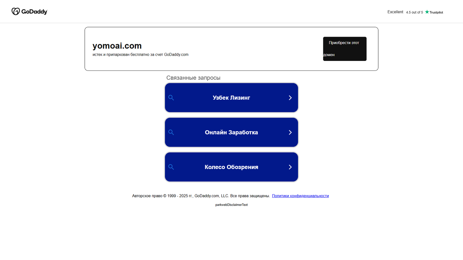 Судя по содержимому, домен yomoai.com истек и сейчас используется как парковочная страница. На ней размещены стандартные элементы GoDaddy: уведомление о завершении регистрации, предложение купить домен и ссылки на юридическую информацию.