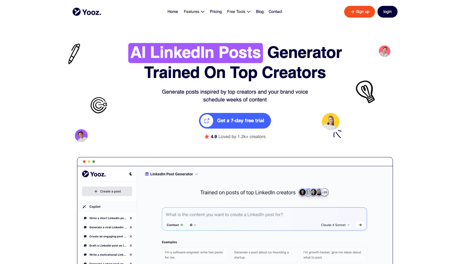 Yooz AI помогает авторам и экспертам системно вести LinkedIn без ручного конвейера постов. Инструмент фокусируется именно на этой сети и учитывает ее формат, алгоритмы и типичный стиль топовых создателей.