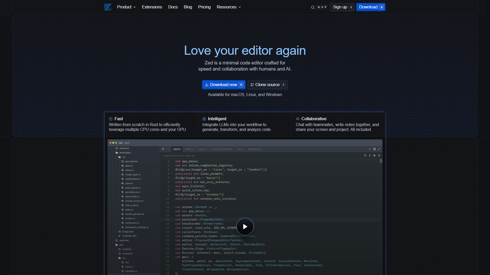 Zed — это высокопроизводительный минималистичный редактор кода с глубокой интеграцией ИИ и мощными возможностями совместной работы в реальном времени. Его создатели — команда, стоящая за Atom и Tree-sitter, поэтому особое внимание уделено скорости, отзывчивости и качеству работы с кодом.