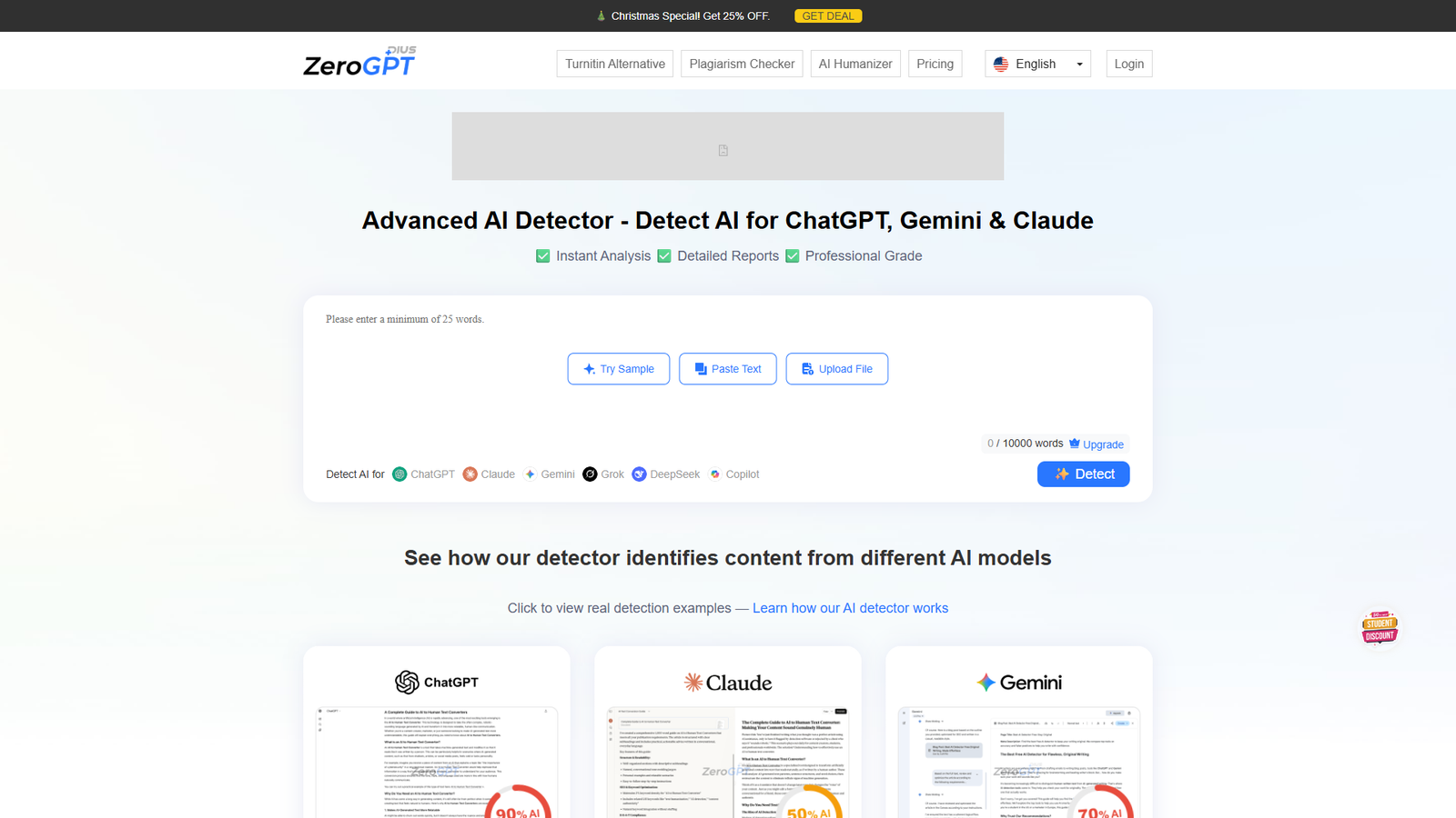 ZeroGPT Plus — онлайн-инструмент для обнаружения текста, созданного нейросетями вроде ChatGPT, GPT‑5, Gemini, Claude, Grok и других популярных моделей. Подходит для преподавателей, студентов, редакторов и компаний, которым важно понимать происхождение контента.