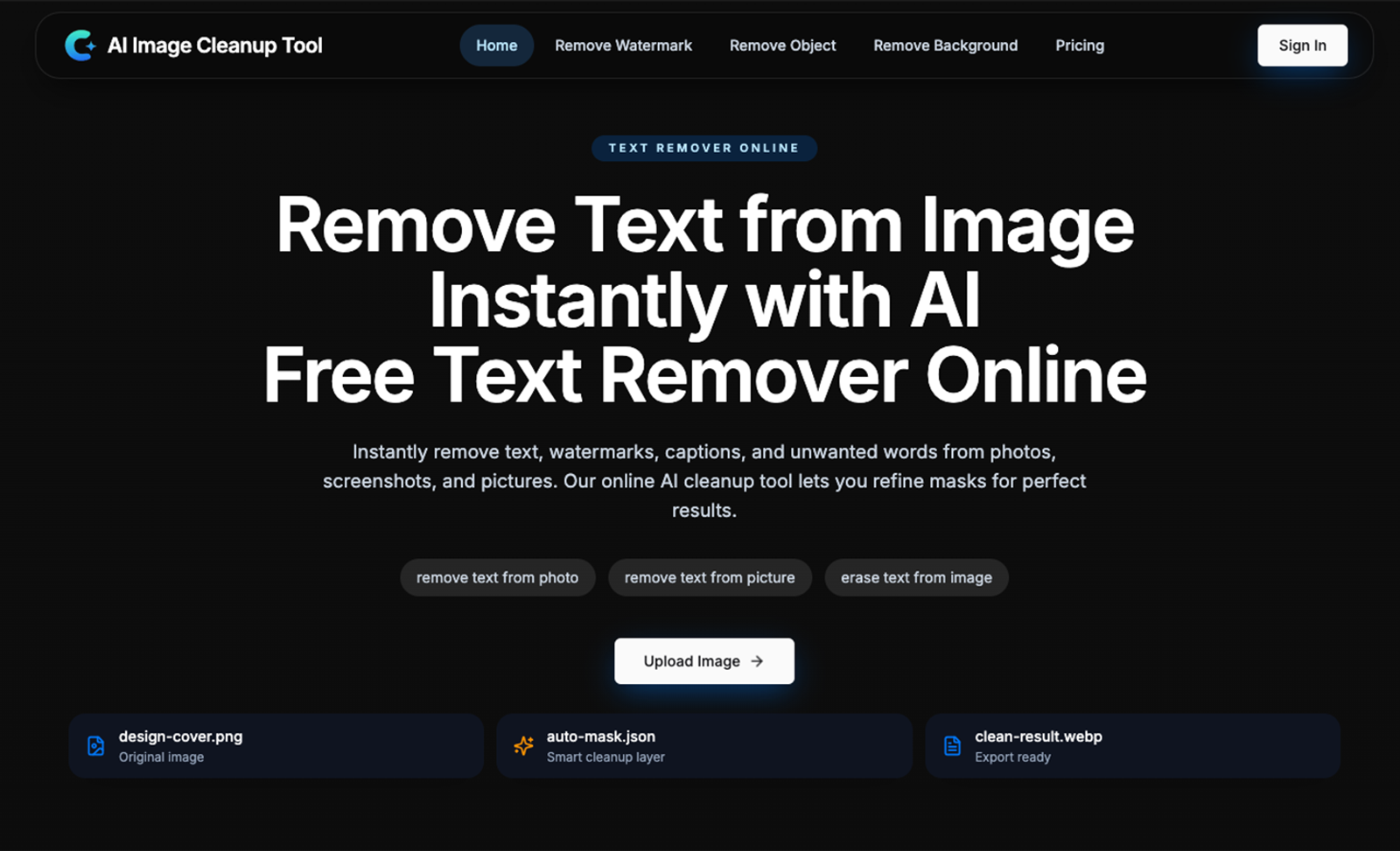 Users can upload JPG, PNG, WEBP files, or screenshots, let the AI detect removable areas automatically, and then fine-tune the mask manually for more precise results before exporting the cleaned image. The site’s core workflow focuses on text removal from photos, pictures, and screenshots, while also offering dedicated tools for watermark removal, object removal, and background removal.